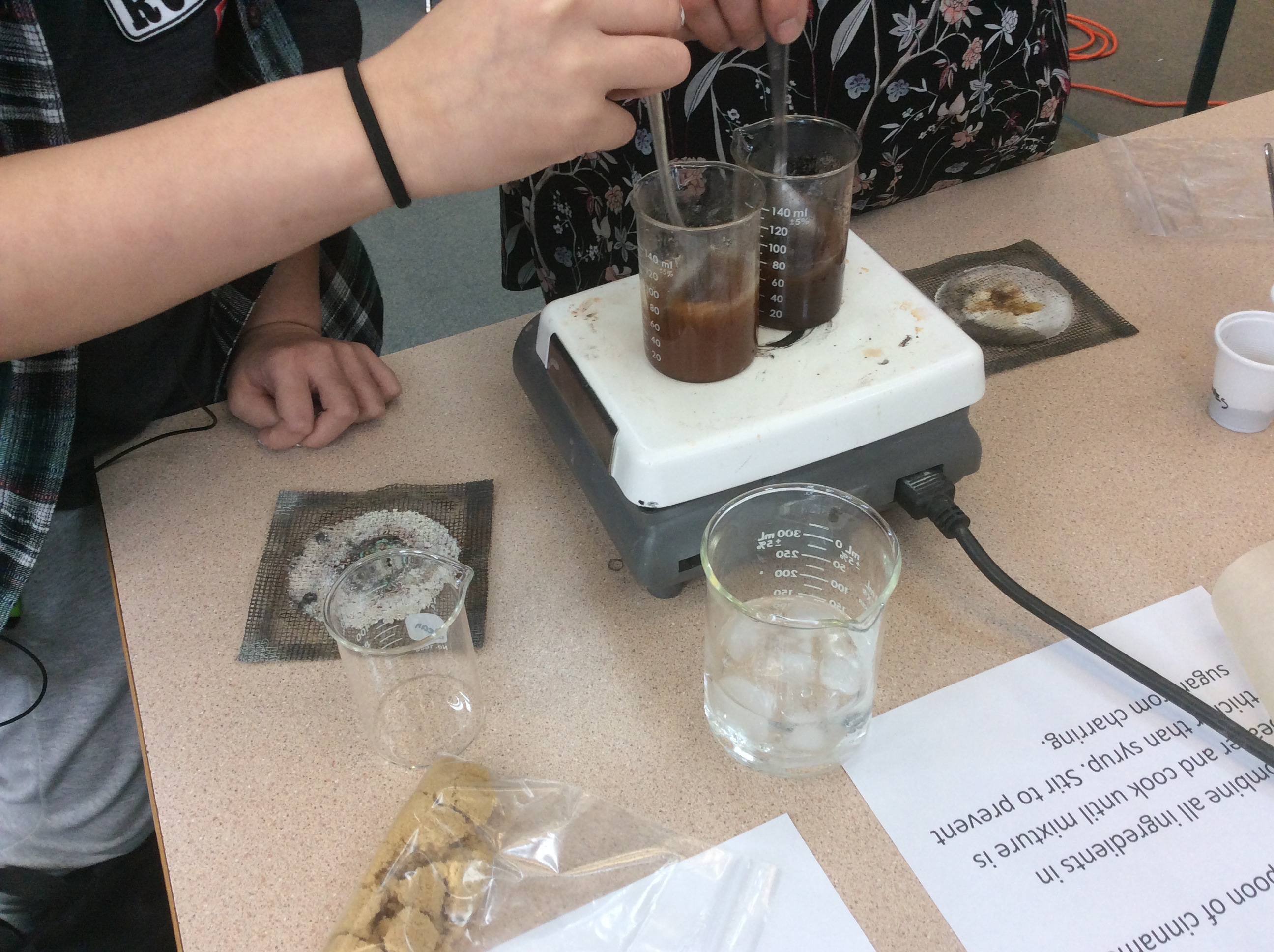 a minor problem presented itself: 4 students were present – and the student who proposed we make cough drops was not present. I was disappointed with turnout – and I thought it still might have something to do with our Makerspace’s relative obscurity with students- but we ended up hosting 10 participants (more students joined in later on). As the workshop progressed, so did the problems: first, circuit breakers were tripped because too many hotplates were in use simultaneously (we solved this by spreading out the hotplates to different outlets); next, cough drop solutions started to overflow onto hotplates (which never happened during our tests and was made worse since we had yet to hand out oven mitts to participants); then, what overflowed onto the hotplates started to burn and produce a lot of smoke (affected hotplates were moved to open windows). Moments later, the fire alarm went off and students had to evacuate the school. I thought it was our fault; but, it turns out, it was merely a coincidence: a fire extinguisher had accidentally gone off in another part of the school during our workshop which set off the alarms.